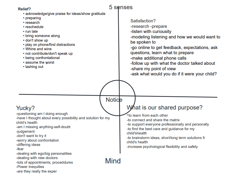 Kathryn with Thrive consultation and therapy has been utilizing the ACT matrix to help model psychological flexible when advocating. In this series three episode, we discuss how to collaborate with your child’s health care provider. Attached above is the me matrix from the discussion in the crowdcast. The ACT matrix is a great tool to utilize daily to work through your feelings. Below is the pro social ACT matrix from the discussion on how to collaborate and advocate with your child’s doctors . We would all enjoy your feedback and experiences with how you work through the matrix to have more psychological flexibility.